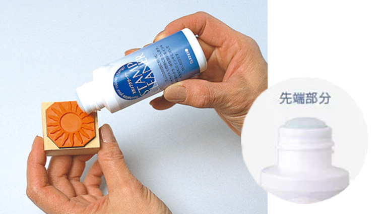 After using ink, apply the cleaner directly onto the rubber stamp surface and wipe it off with a cloth. Alternatively, place a cloth moistened with the cleaner on the stamp surface to remove the ink. If the ink is stubborn, wait a moment before wiping.