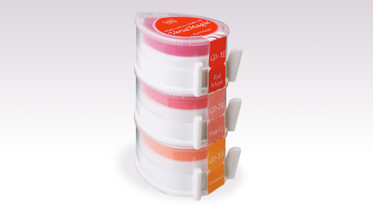 The stamp pads can be stored stacked on top of each other. Each pad also has a color label on the side, so you can quickly identify the color.